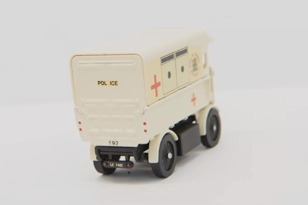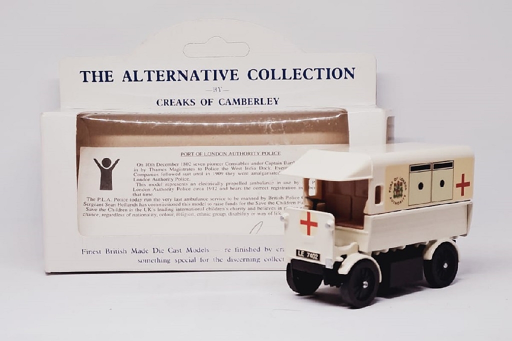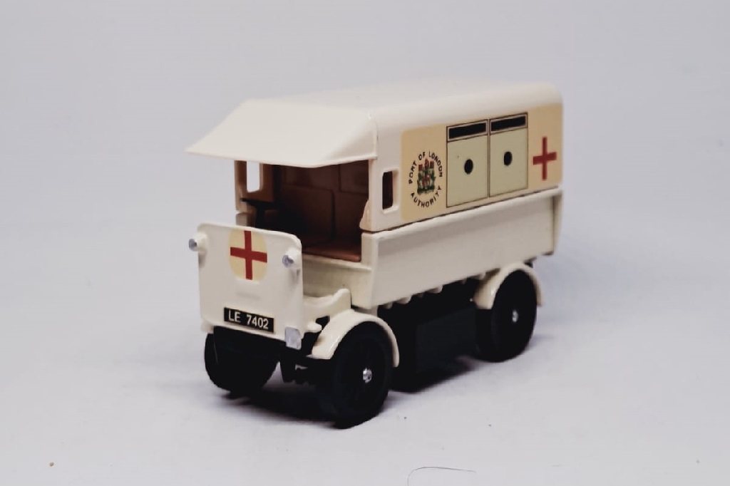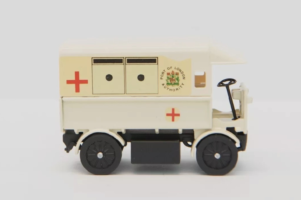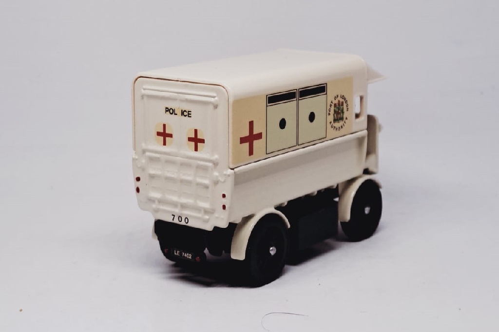 This model represents an electrically propelled ambulance in use by the Port of London Authority Police circa 1912 and bears the correct registration number from that time.