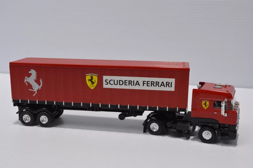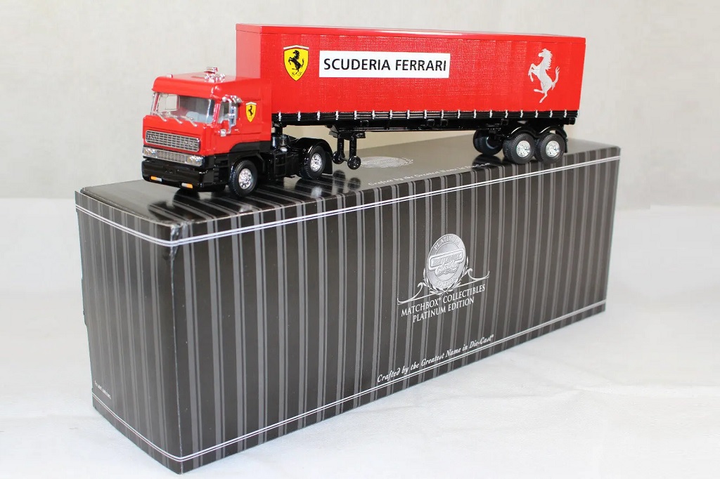 Born in 1898, Enzo Ferrari is a giant in the annals of automotive history. He began driving at age 13, became an instructer in the Modena Fire Brigade workshop, then went on to fulfill his dreams as a race car and test car driver. In 1920, he began working for Alfa Romeo and, in 1929, he founded Ferrari in Modena, Italy, as a racing club. This division of Alfa Romeo gained its independence in 1940. And now, to commemorate the company that built some of the greatest and most stylish cars of all time. Ferrari has authorized Matchbox Collectibles to create a die-cast tractor trailer decorated with the famed Ferrari emblem, which first appeared on the fuselage of the fighter plane flown by Francesco Baracca, the heroic Italian World War I pilot. The pilot's parents suggested Enzo Ferrari adopt the prancing horse as the Ferrari emblem to bring him good luck. Enzo added the canary yellow background, saying it is the colour of Modena.