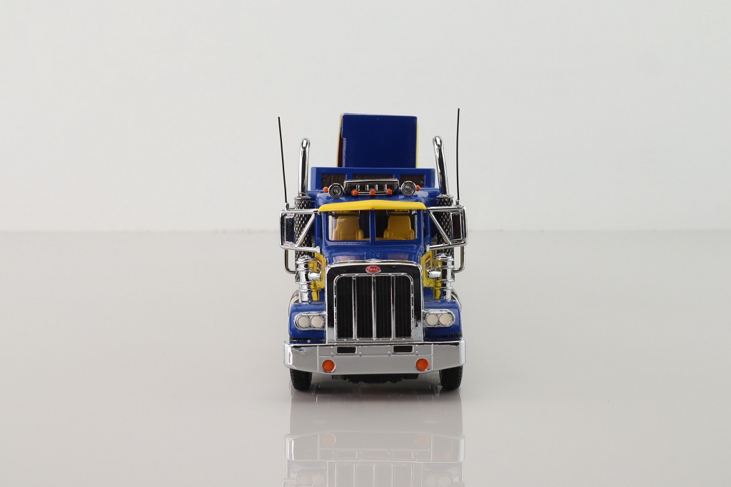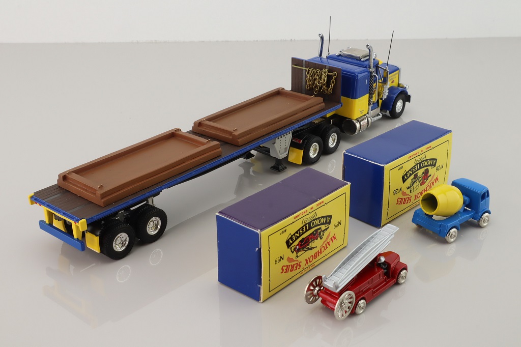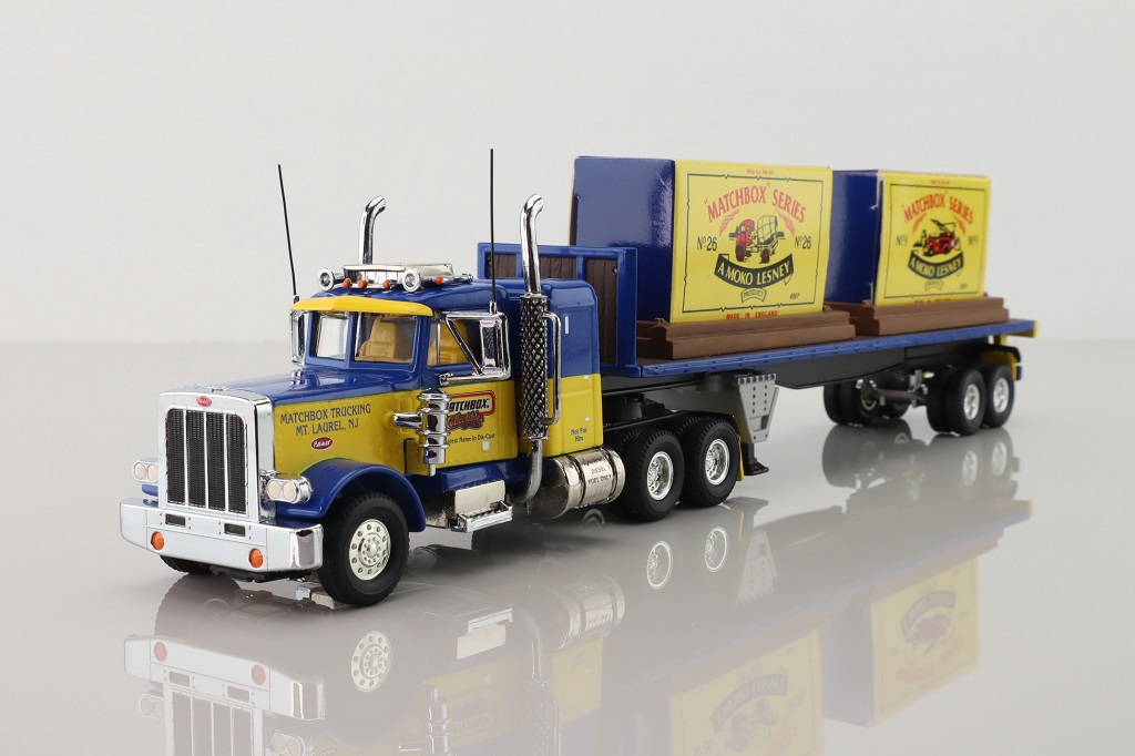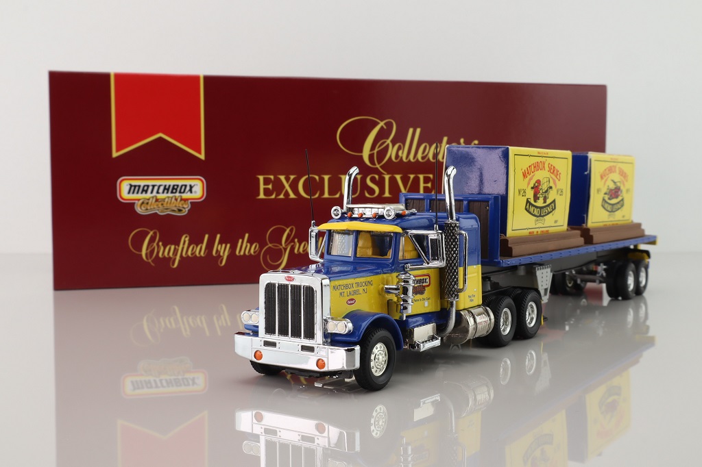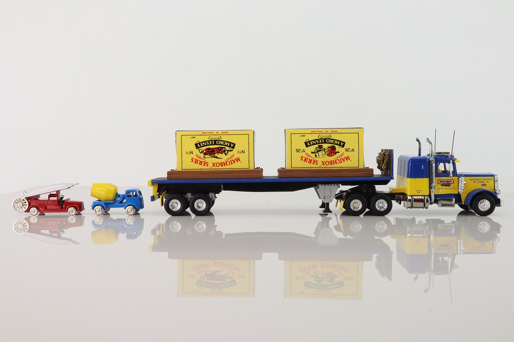 Among the earliest die-cast toys issued under the Moko and Lesney names were a 1955 model of a Dennis Fire Escape vehicle and a 1956 replica of a Concrete Truck. These two vintage models can now be found inside replicas of the original matchboxes that were used as packaging, ultimately leading Lesney to change its name to Matchbox. The models are based on original tooling from the Matchbox Archives. Bearing lettering that dates back to the early days, the matchboxes are transported on an open trailer pulled by a Peterbilt 359 cab, decorated with the Matchbox Collectibles logo and slogan: Crafted by the Greatest Name in Die-Cast. The cab captures an impressive array of authentic, chrome-finished details, including the front grille, exhaust pipes, whip antennae and mirror and window trim. This model is painted in the colours of the early days of Matchbox: blue, yellow and purple.