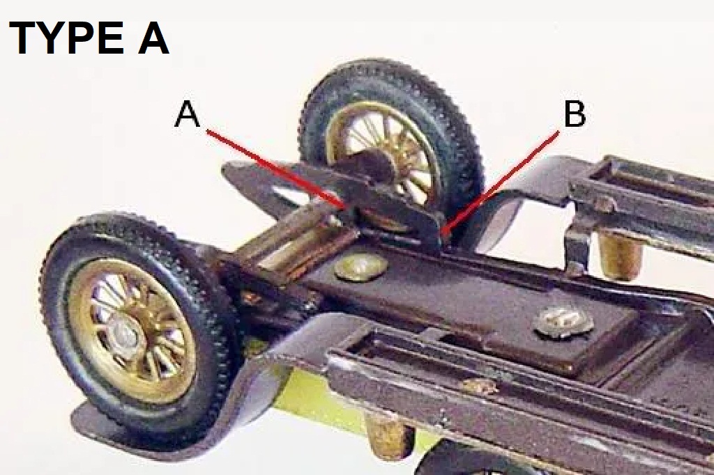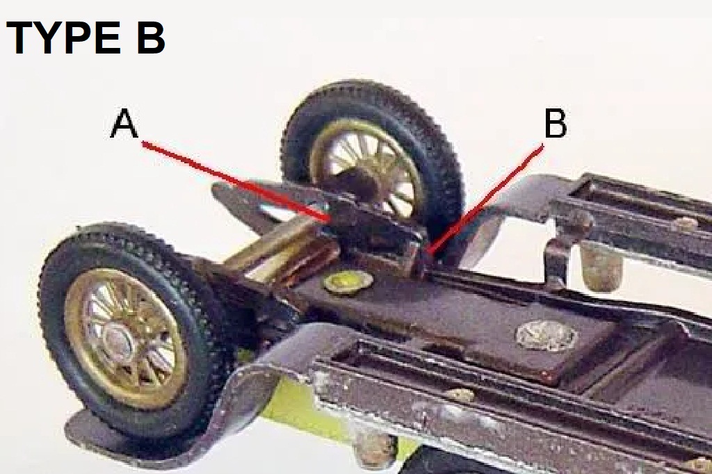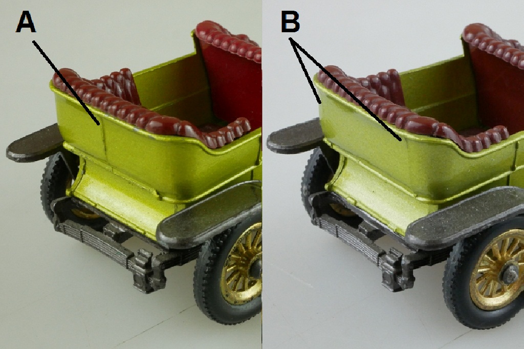 (A) an early issue rear body casting with a single casting line at the rear of the body. (B) a later issue with two casting lines |
