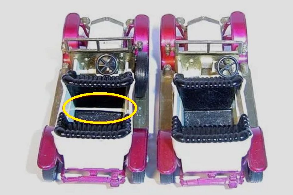 | 4 | 1974 | White body, glossy purple chassis | Dark red | Dark red or black | Brass | Chrome 12 spoke | B | B | LESNEY © 1969 ENGLAND | H | |