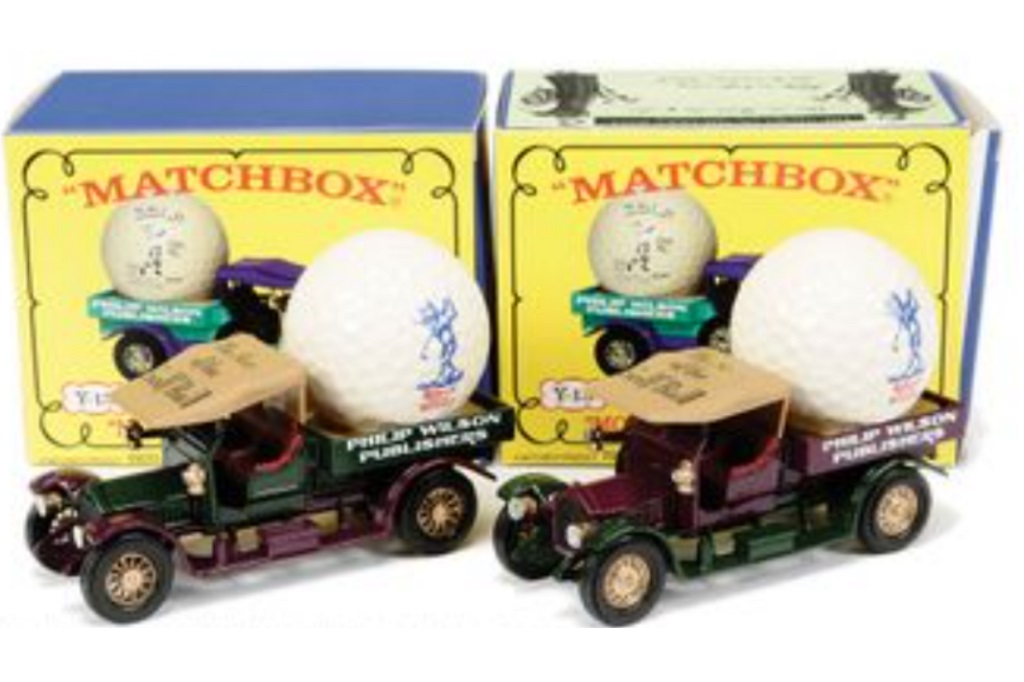 | 1 | 2003 | Dark green body & bonnet, glossy purple chassis (standard) | Light brown | Maroon plastic | Black | Black plastic | Gold/Brass | Gold 12 spoke | PHILIP WILSON PUBLISHERS | LESNEY © 1973 ENGLAND | S | Retro |