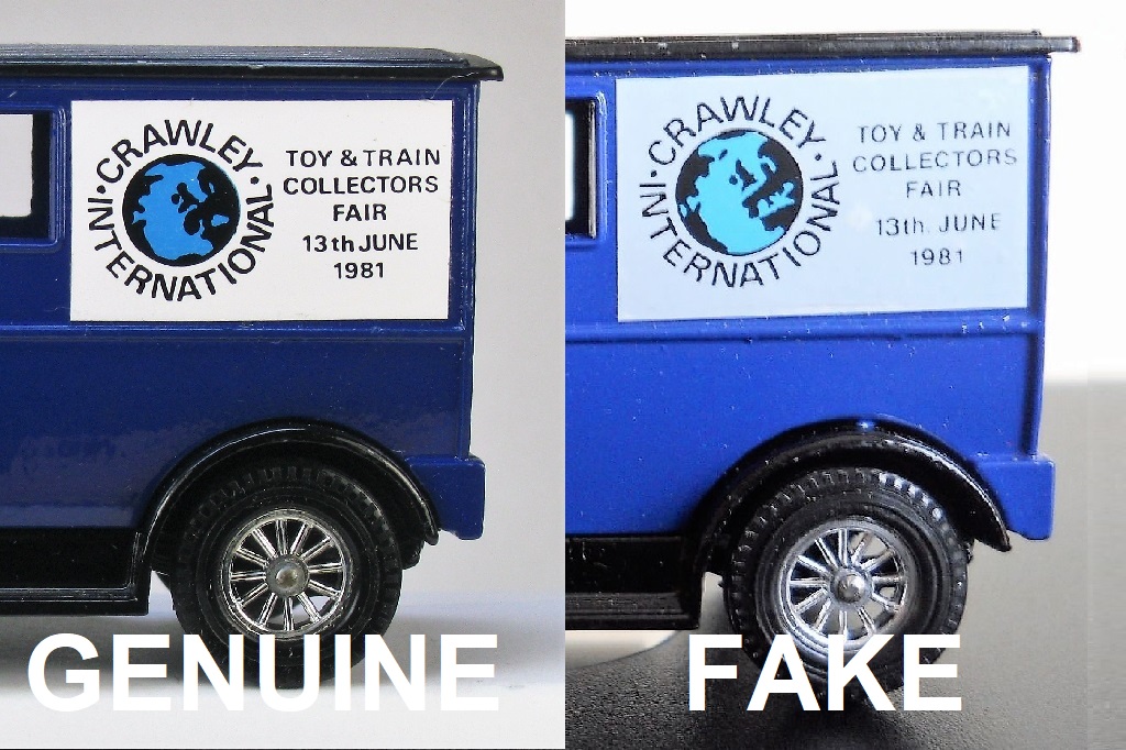 Lesney Products gave permission to Messrs. Jeff Haughton and Mike Spencer to produce a promotional model based on the blue Talbot van to be sold to collectors attending the Crawley International Toy and Train Fair which was held on Saturday 13th June 1981 at the Crawley Leisure Centre, Haslet Avenue, Crawley, Sussex, England. These promotional models were sold direct to collectors at the Toy Fair for £4.50 per model and unsold models were then supplied to collectors who could not attend the Swapmeet at £5.00 per model.
