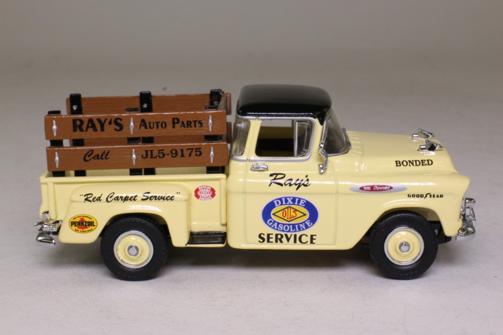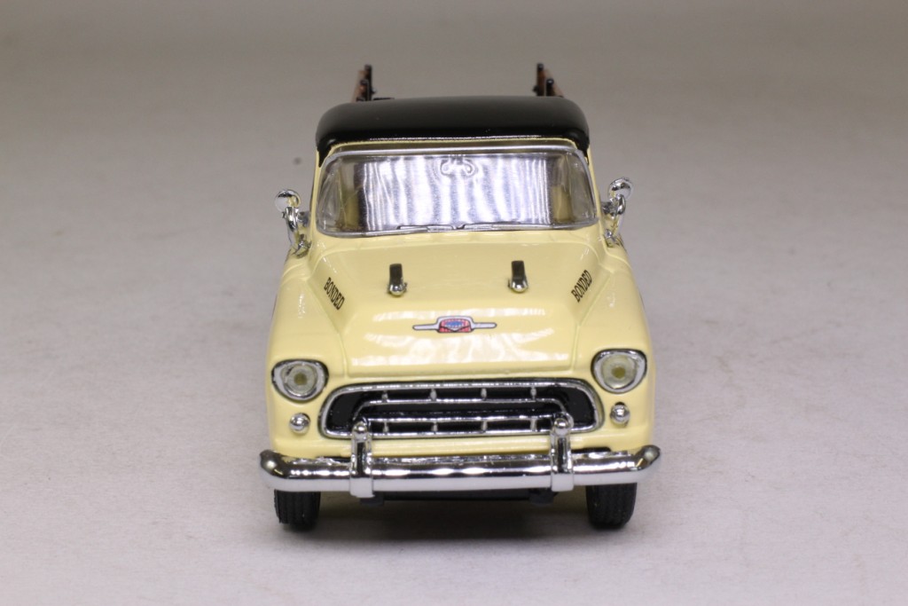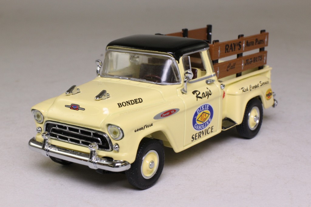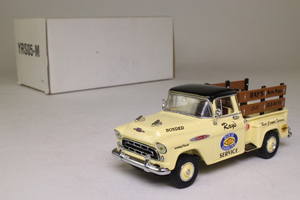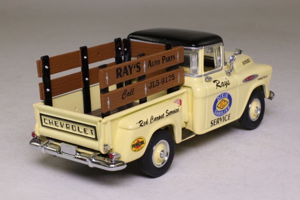 | 1 | 1996 | Rich cream body, black chassis | Rich cream | Black | Rich cream & dark brown | Dark brown | Silver | Chrome, black infill | Rich cream solid chrome caps & rims | Yes | Chrome | Silver, red rear lights | Bronze | Black tampo YRS05 | Cast MODELS OF YESTERYEAR Black tampo 1957 CHEVROLET 3100 |